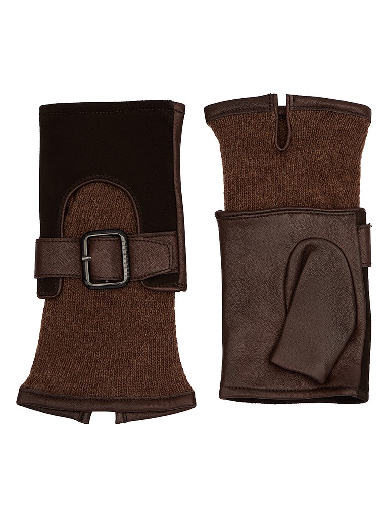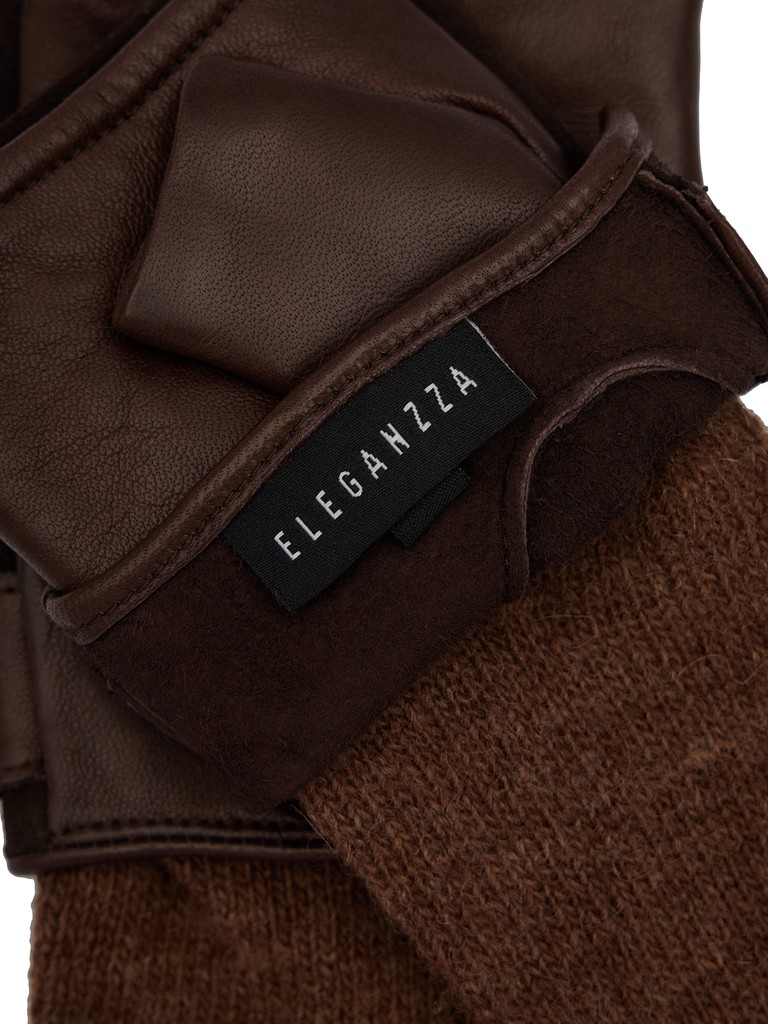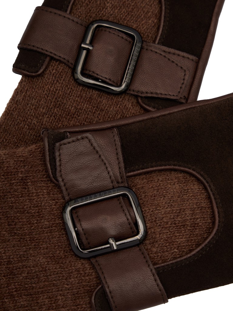 Митенки торговой марки ELEGANZZA атуральной кожи ягнёнка и натурального велюра. Подкладка и манжет - 85% шерсть, 15% кашемир. Митенка украшена пряжкой с символикой бренда. Длина манжеты от нижней точки большого пальца до края перчаток - 1,5 см.