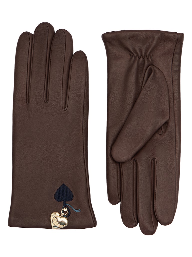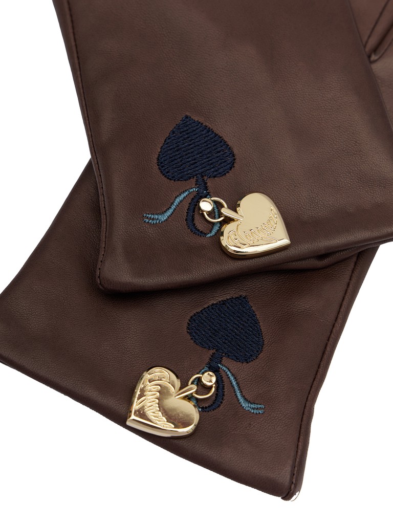 Перчатки ELEGANZZA из кожи ягненка с контрастной вышивкой. Материал — натуральная кожа итальянского производства. Подкладка из смеси шерсти с кашемиром (85/15) обеспечивает тепло и комфорт. Ключевая деталь — эксклюзивный декор в форме металлического сердечка с символикой бренда. Его форма дублируется контрастной вышивкой, что создает многослойный графический акцент. Длина манжеты — 4 см от нижней точки большого пальца до края перчаток. Длина пальцев — средняя.