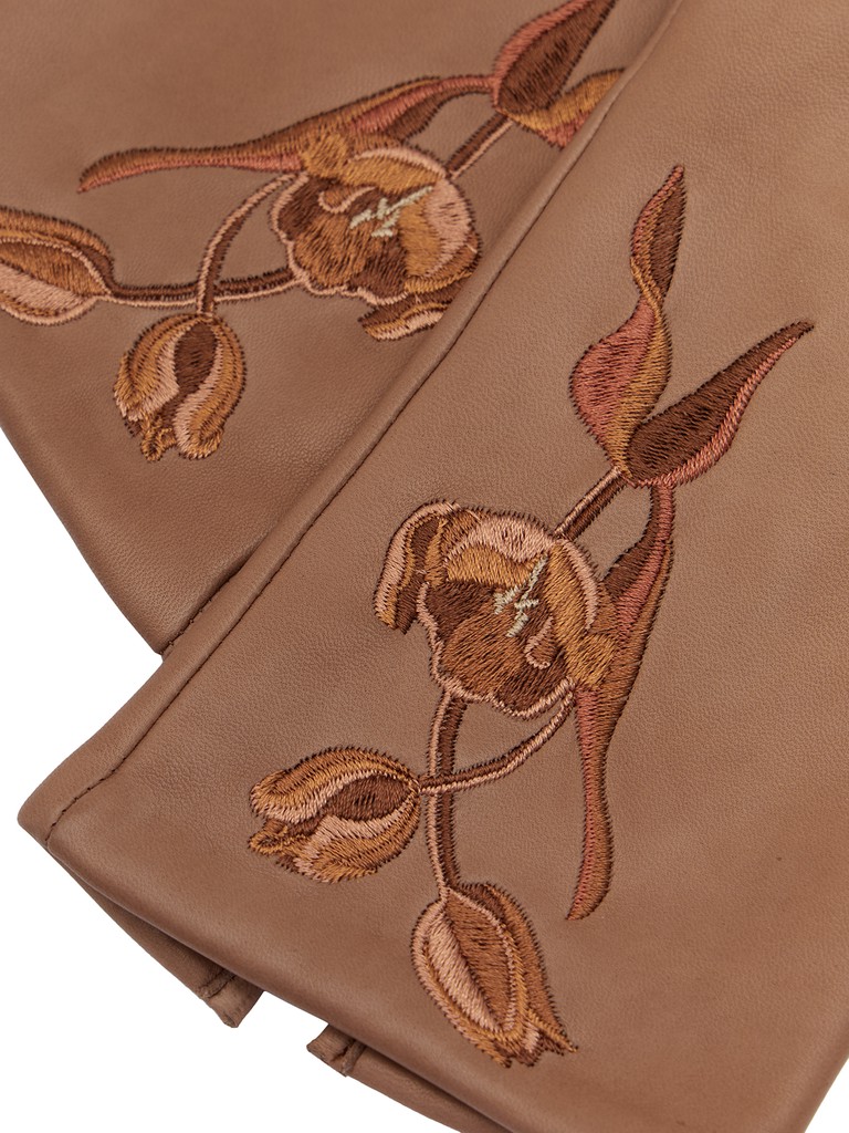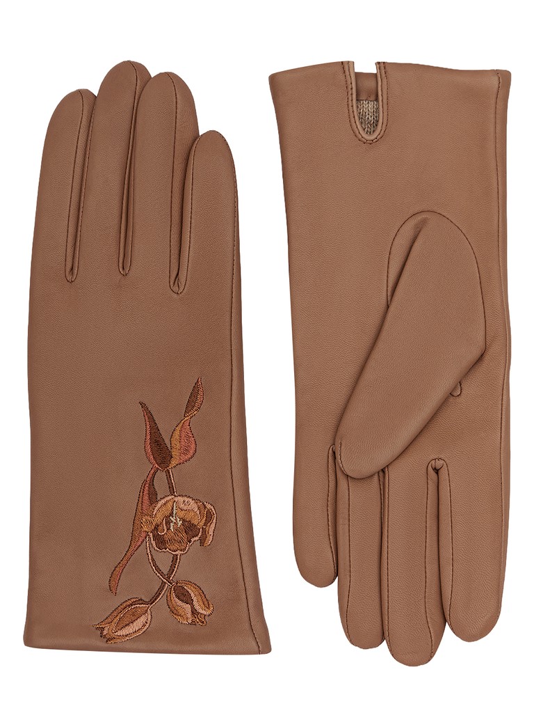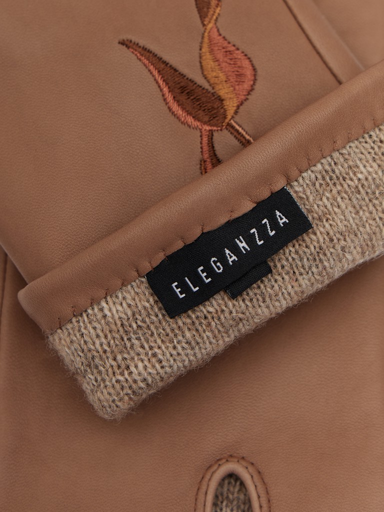 Перчатки ELEGANZZA из кожи ягненка с контрастной цветочной вышивкой. Материал — натуральная кожа итальянского производства. Подкладка из смеси шерсти с кашемиром (85/15) обеспечивает тепло и комфорт. Ключевая деталь — вышивка в форме цветов контрастного цвета, расположенная на внешней стороне. Декор добавляет графичности и делает модель акцентной. Длина манжеты — 6 см от нижней точки большого пальца до края перчаток. Длина пальцев — средняя.