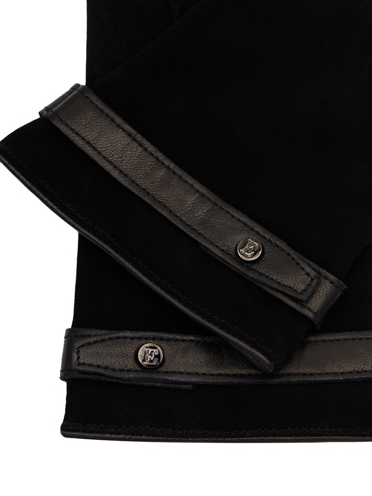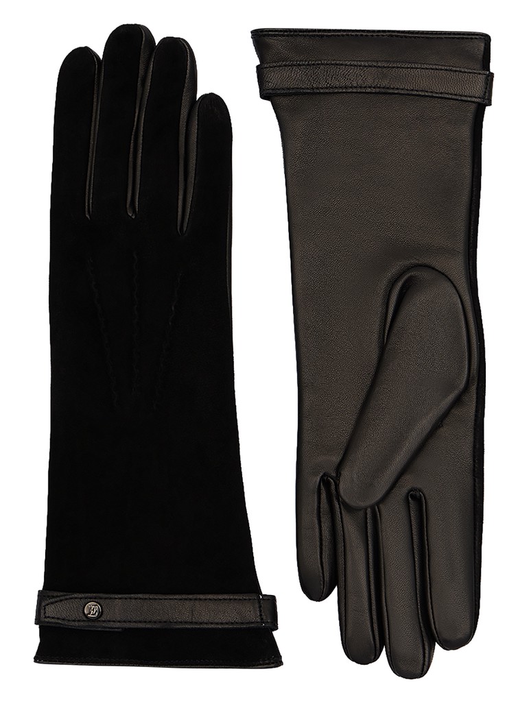 Трендовые удлиненные женские перчатки торговой марки ELEGANZZA. Выполнены из эксклюзивной итальянской кожи ягнёнка и велюра. Подкладка из шерстяной пряжи с добавлением кашемира. Манжеты украшены ремешком на кнопке с фирменной символикой бренда. Модель со средней длиной пальцев и длиной манжеты от нижней точки большого пальца до края перчаток - 11 см.