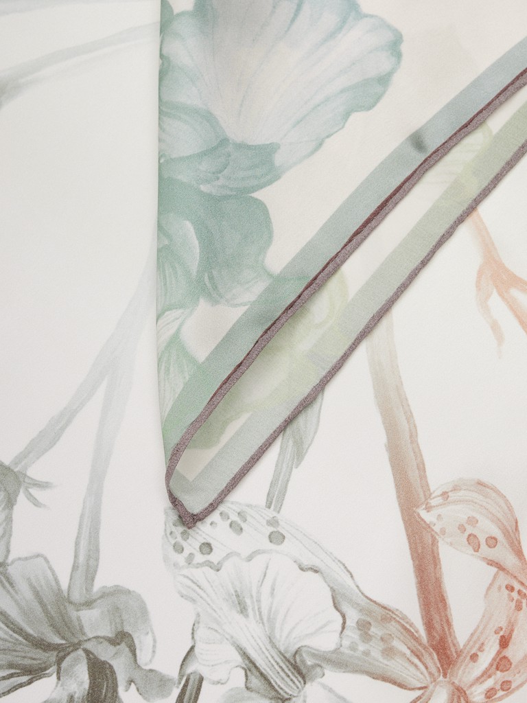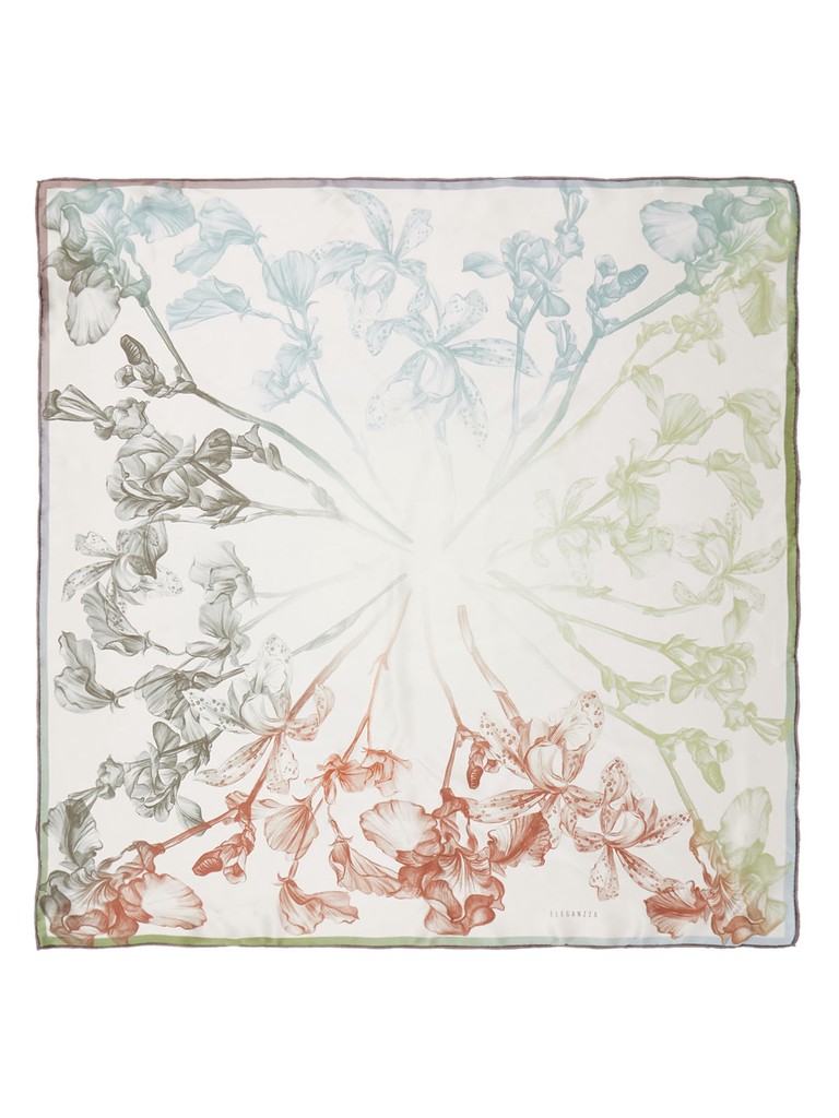 Женский платок торговой марки ELEGANZZA. Платок с принтом букета ирисов: композиция разделена на четыре части, и в каждой четверти букет раскрывается в собственной цветовой гамме. Такой переход оттенков делает рисунок динамичным и многогранным, сохраняя элегантность классических цветов.
