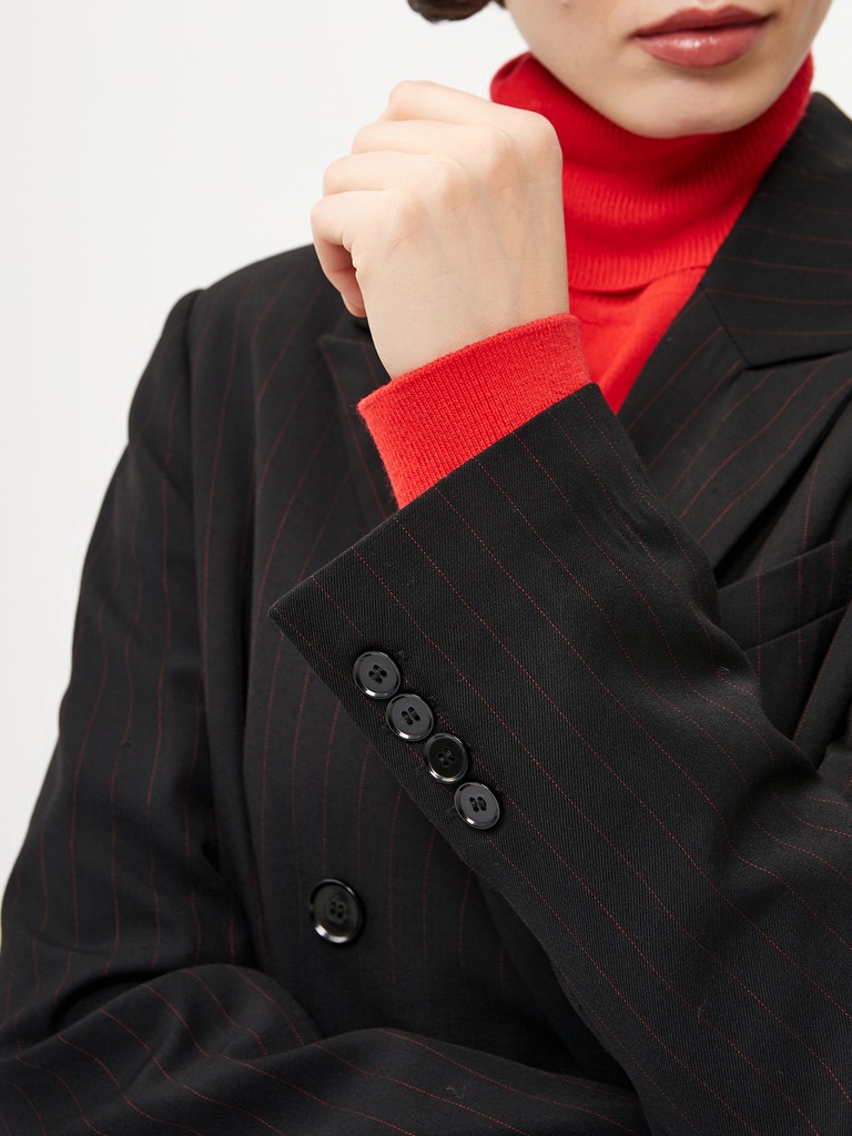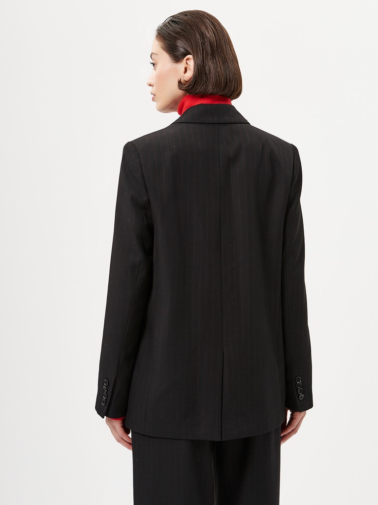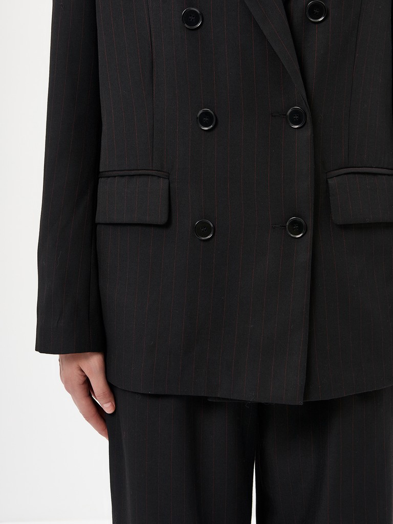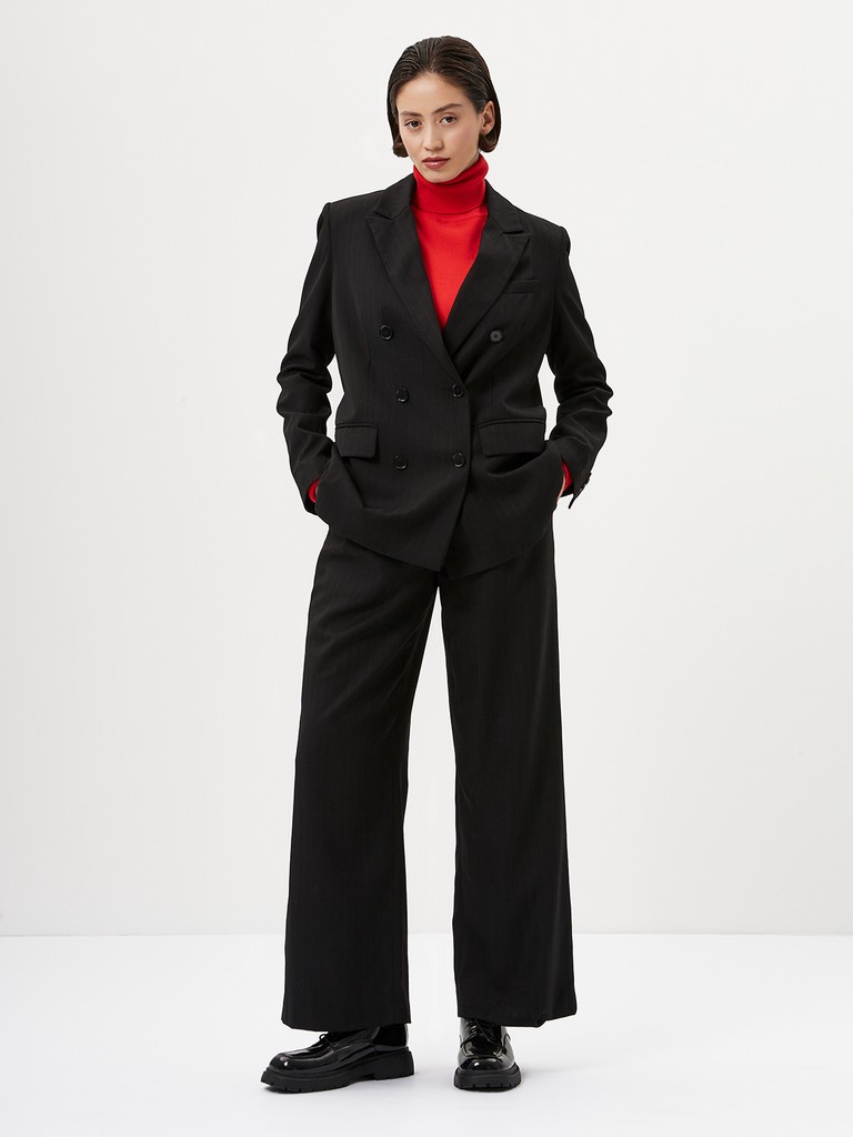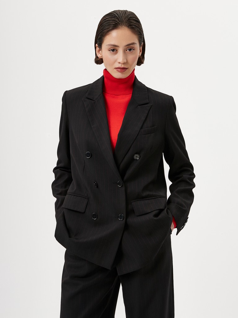 Двубортный женский жакет полуприлегающего силуэта, выполненный из премиальной ткани с добавлением мягкой шерсти. Элегантный английский воротник и прорезные карманы с клапанами создают утонченную строгость. Удлиненные рукава с пуговицами держат форму, подчеркивая безупречный крой.