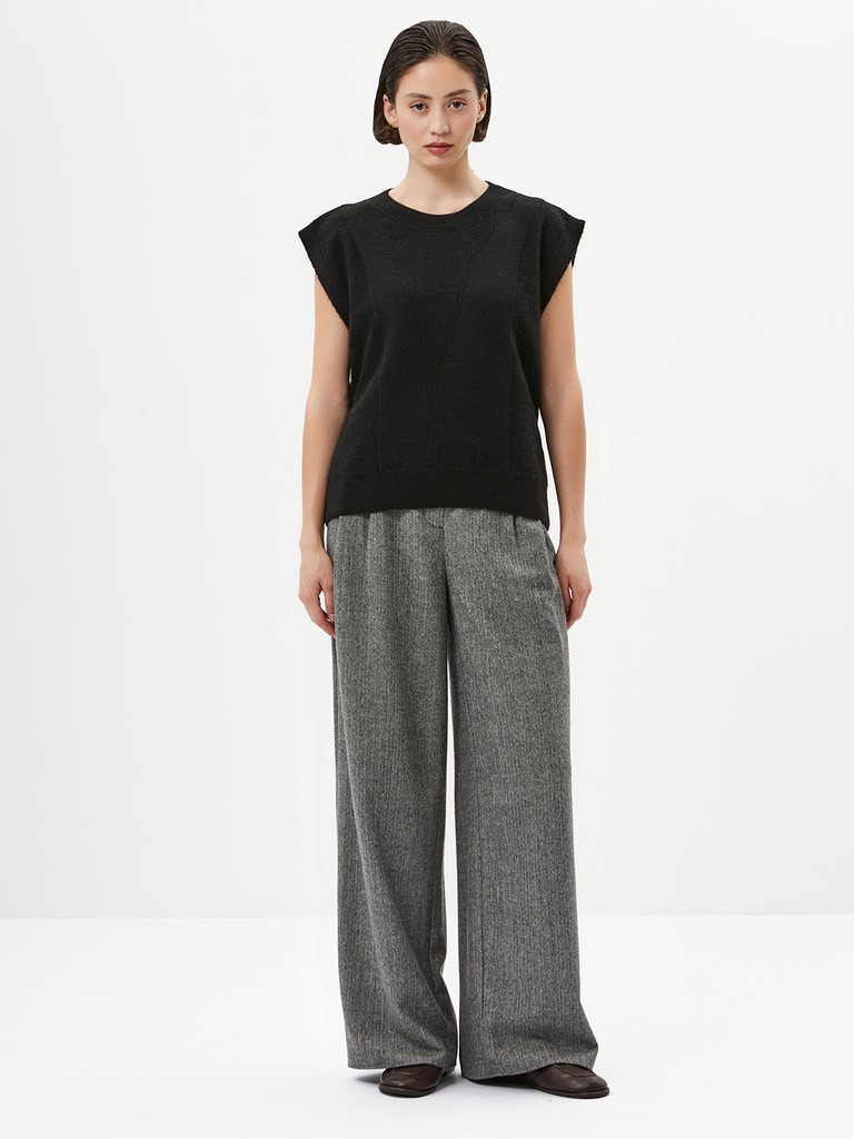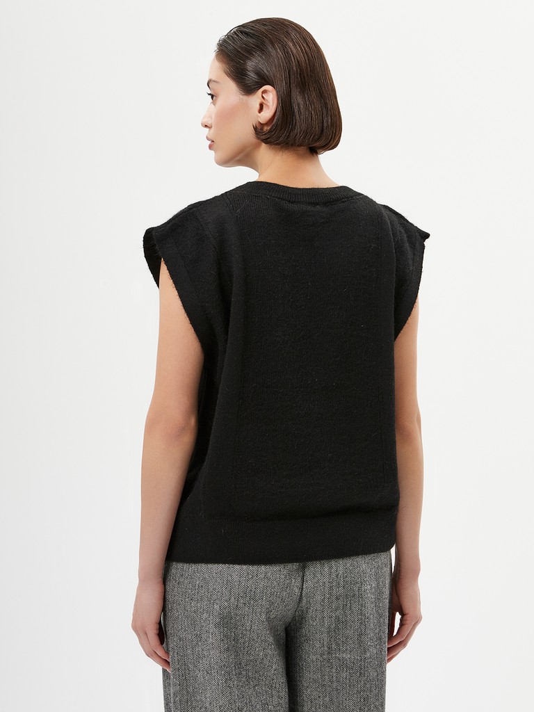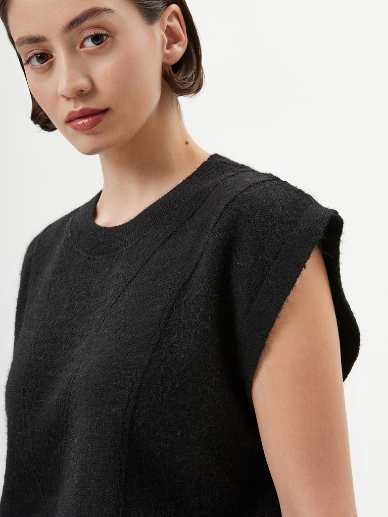 Вязаный женский прямой жилет для лаконичных образов с акцентом на открытые плечи. Выполнен из приятной на ощупь меланжевой теплой пряжи с добавлением мохера. Изделие дополнено акцентной деталью - декоративными ажурными элементами.