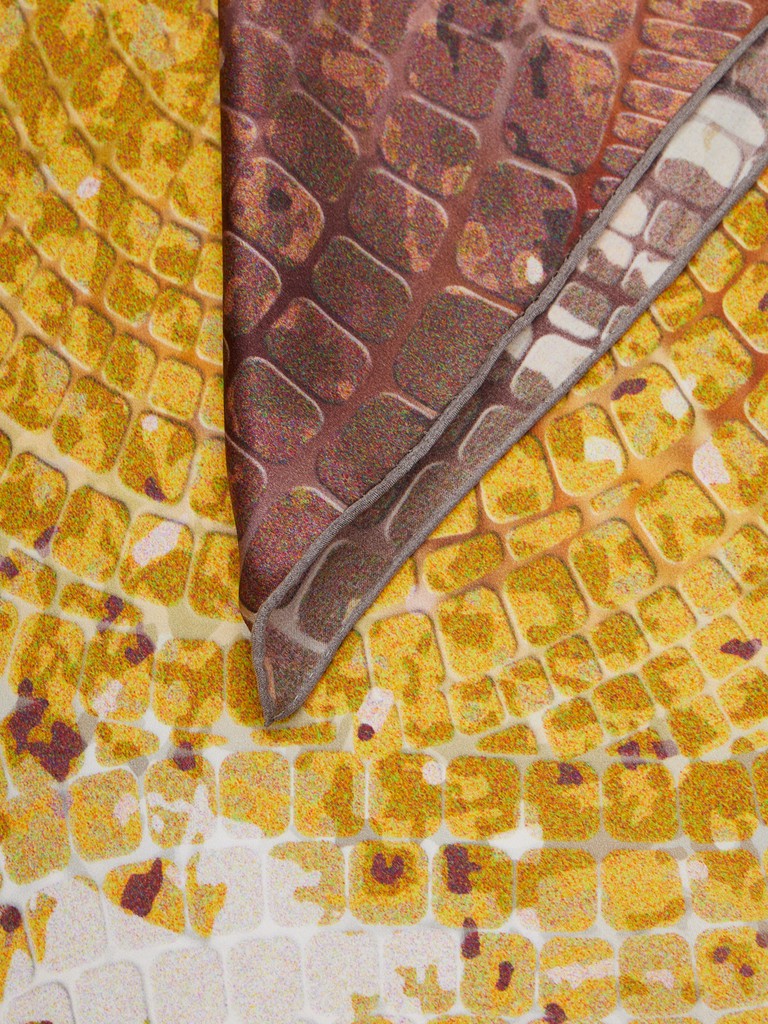 Женский платок торговой марки ELEGANZZA. Платок с принтом, вдохновлённым античной мозаикой: узор напоминает собранное вручную панно из мелких фрагментов, с выразительной фактурой и ощущением «камня» и времени. Такой рисунок добавляет образу благородный, культурный акцент и смотрится как арт-деталь.