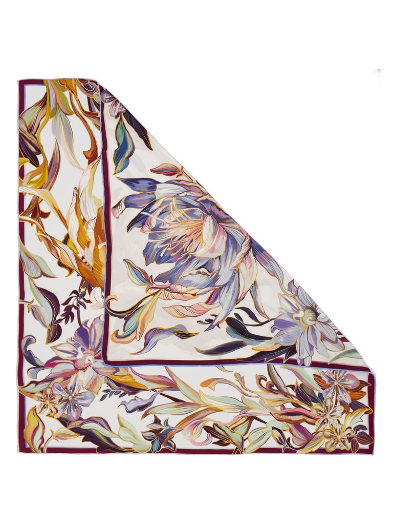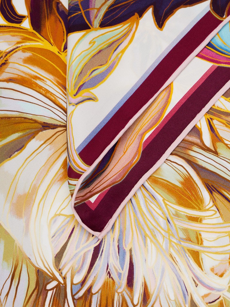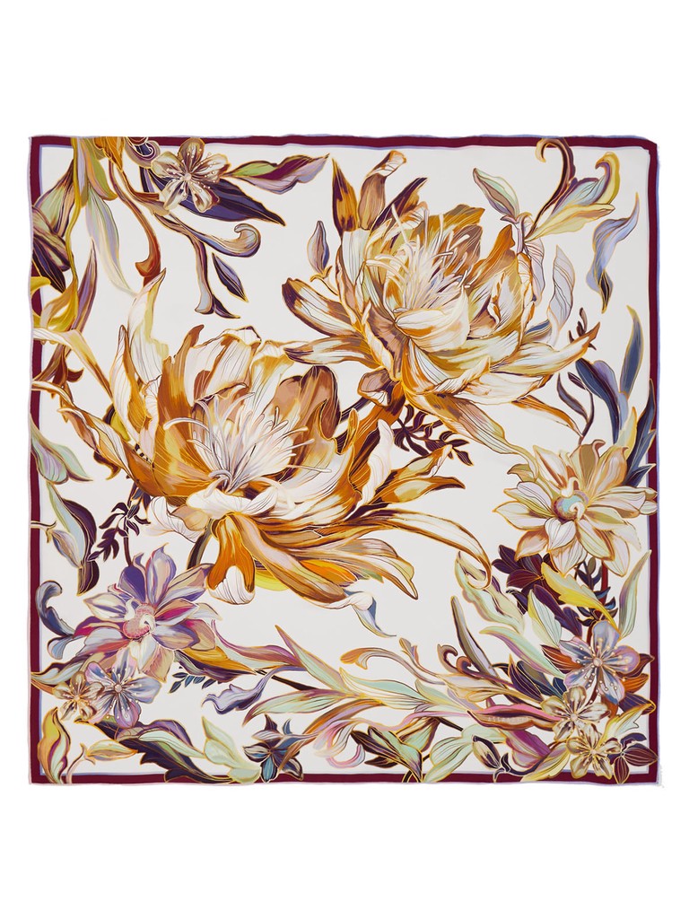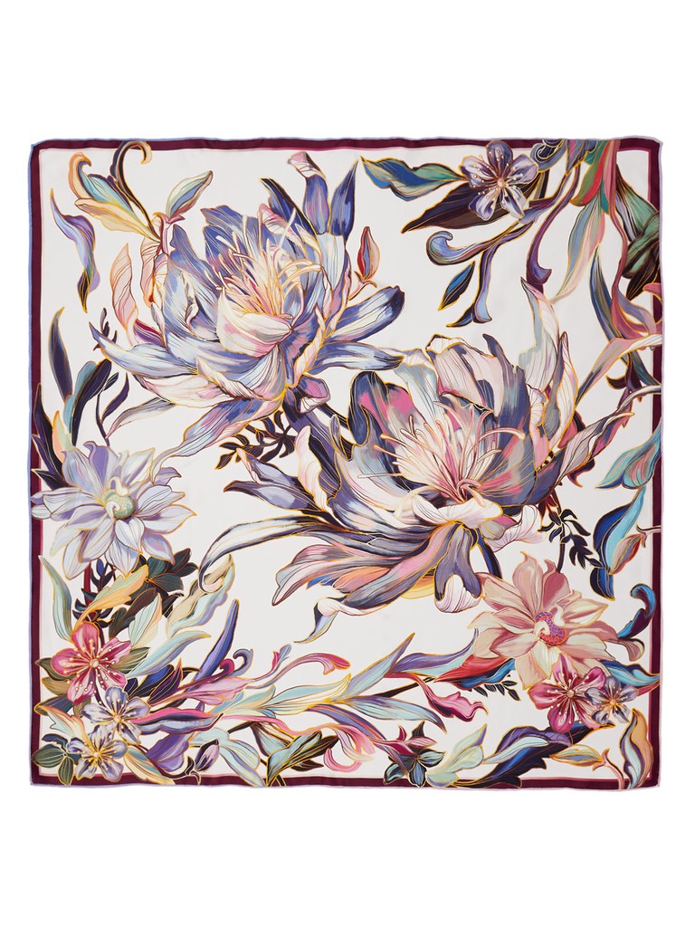 Женский платок торговой марки ELEGANZZA. Двусторонний платок с пышными раскидистыми цветами. По краям лепестков — эффект металлической заливки: будто тонкий слой золота или платины подчеркивает контур и добавляет принту ювелирное сияние.