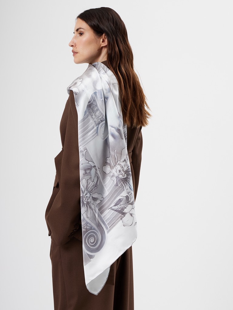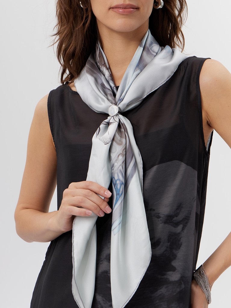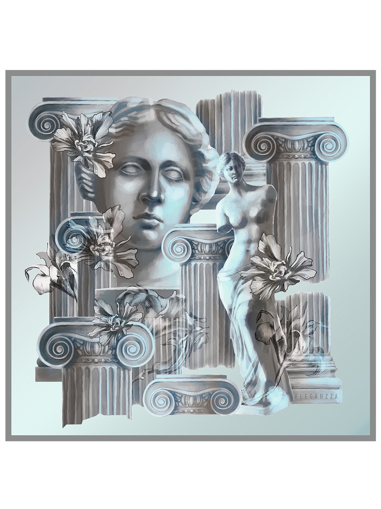 Женский платок торговой марки ELEGANZZA. Платок с парным дизайном к одежде из коллекции бренда: греческий орнамент в современной интерпретации — выверенная геометрия, ритмичный рисунок и выразительные контрасты.