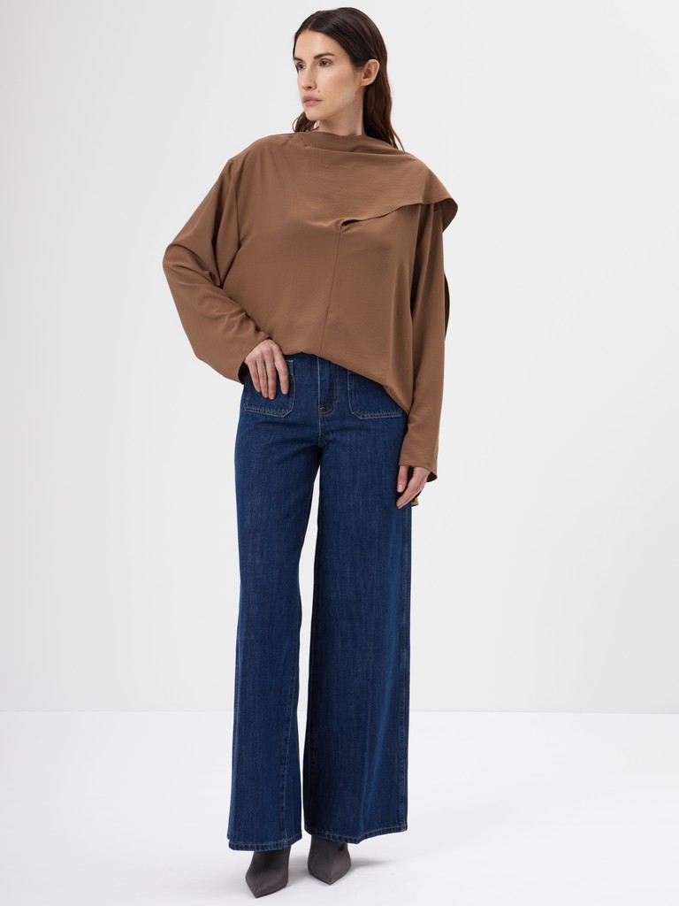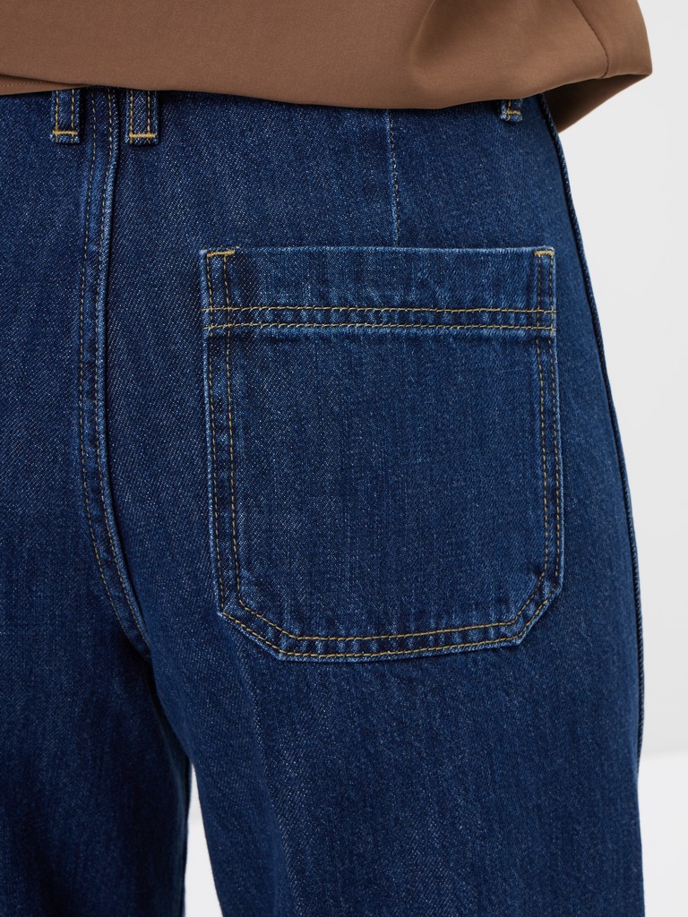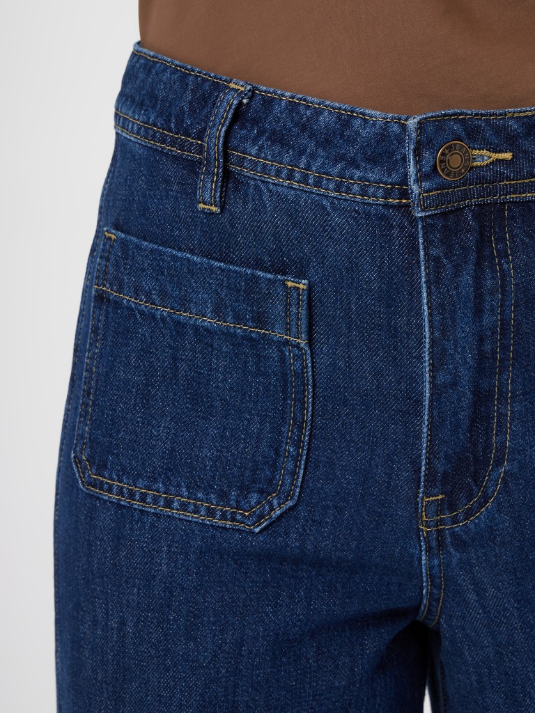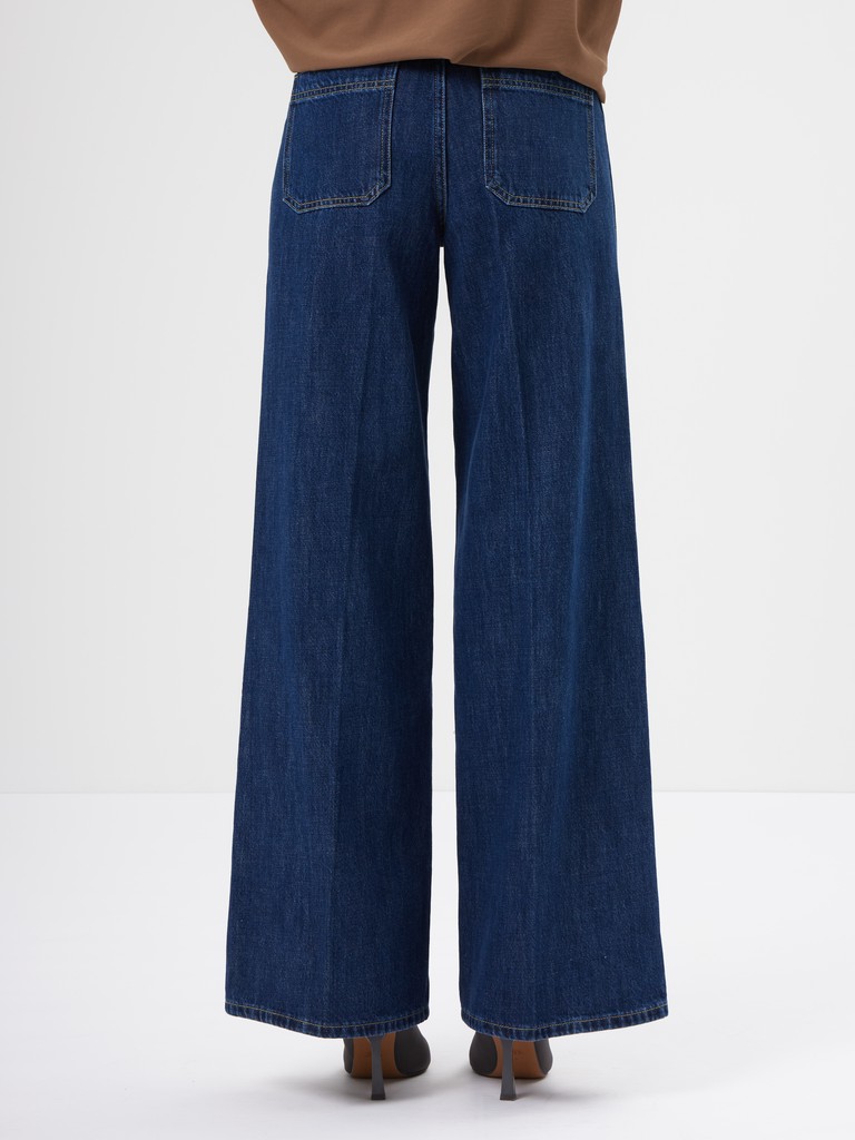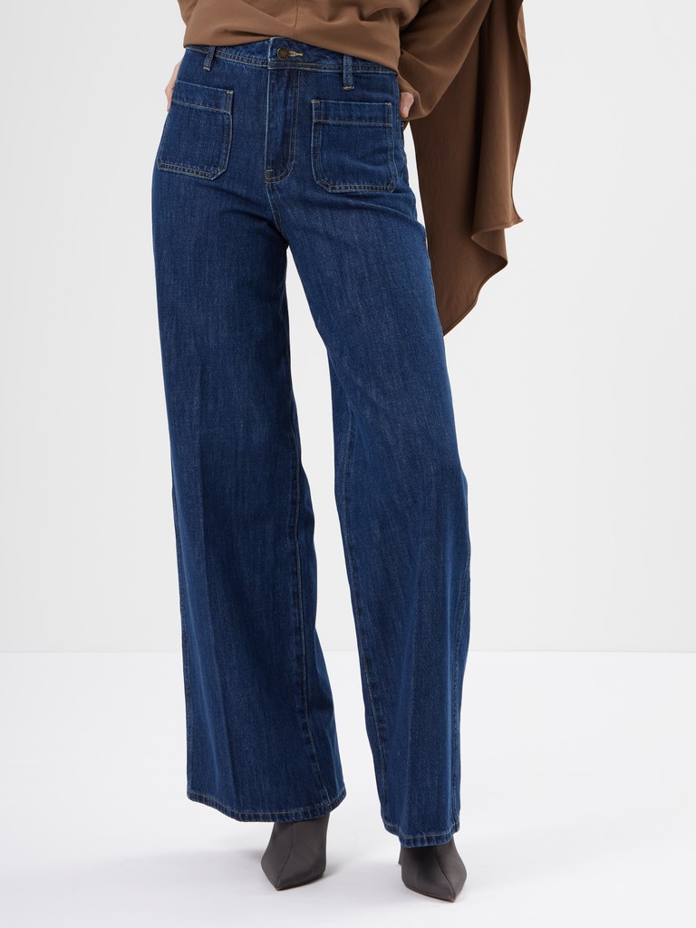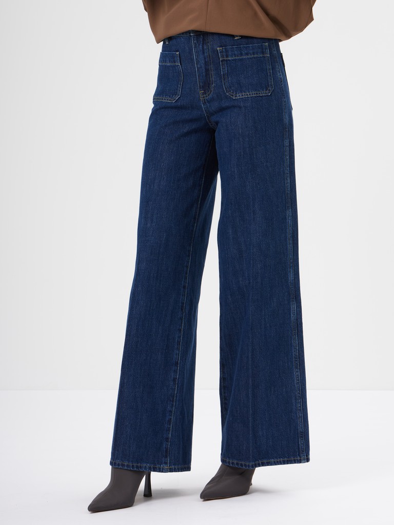 Джинсы в насыщенном оттенке- эффектная модель для современных образов. Высокая посадка подчеркивает талию, а свободный крой и ишрокие брючины визуально вытягивают силуэт и создают выразительную, актуальную форму. Накладные карманы спереди добавляют модели характер и делают дизайн более акцентным.