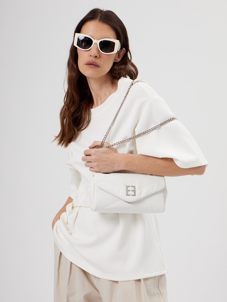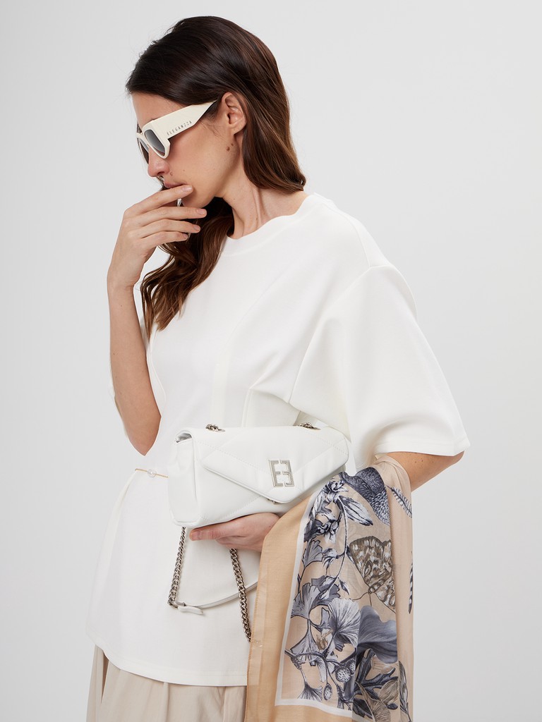 Женская сумка торговой марки Eleganzza из натуральной кожи. Модель закрывается клапаном и фиксируется металлическим элементом. Внутри одно отделение с двумя открытыми карманами. Высота ручек — 55 см. Модель не имеет ножек на дне. Не вмещает формат А4.