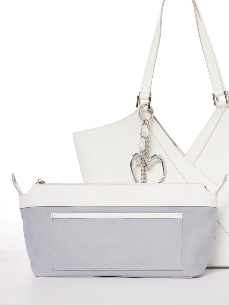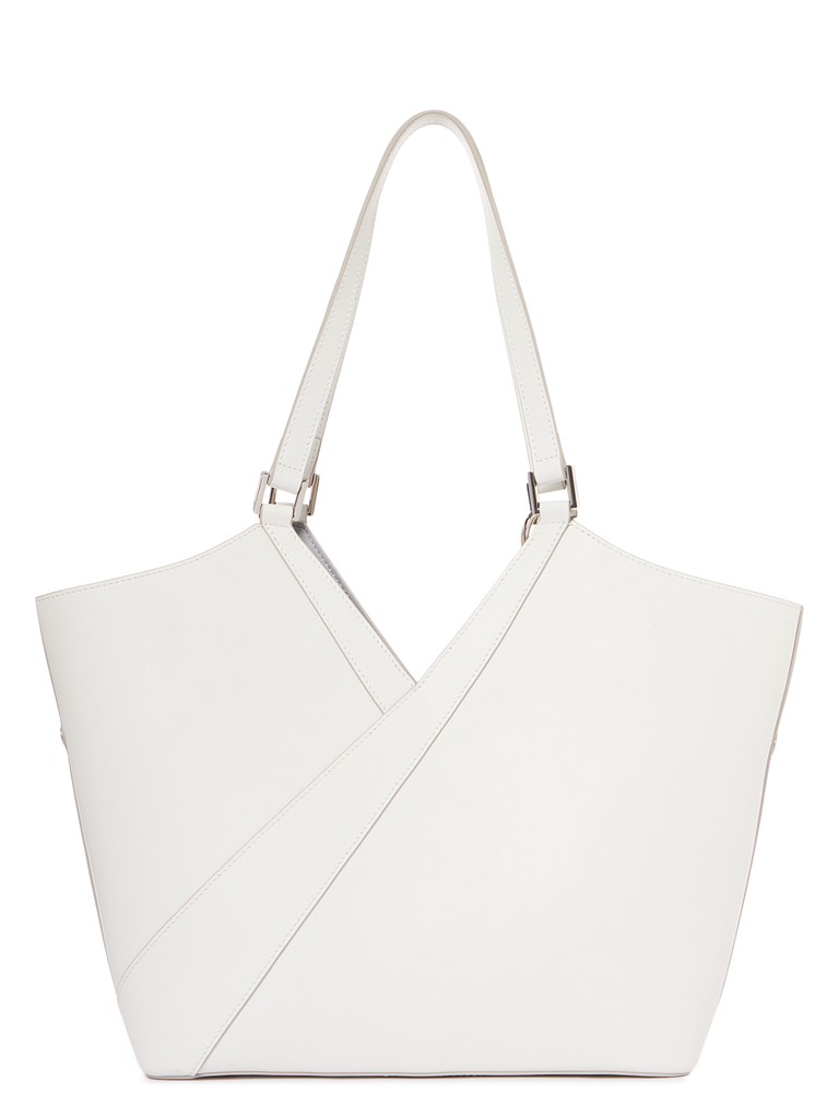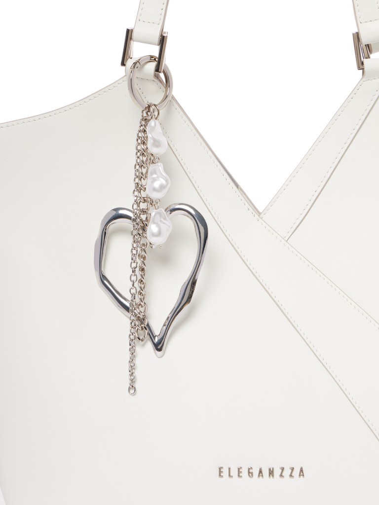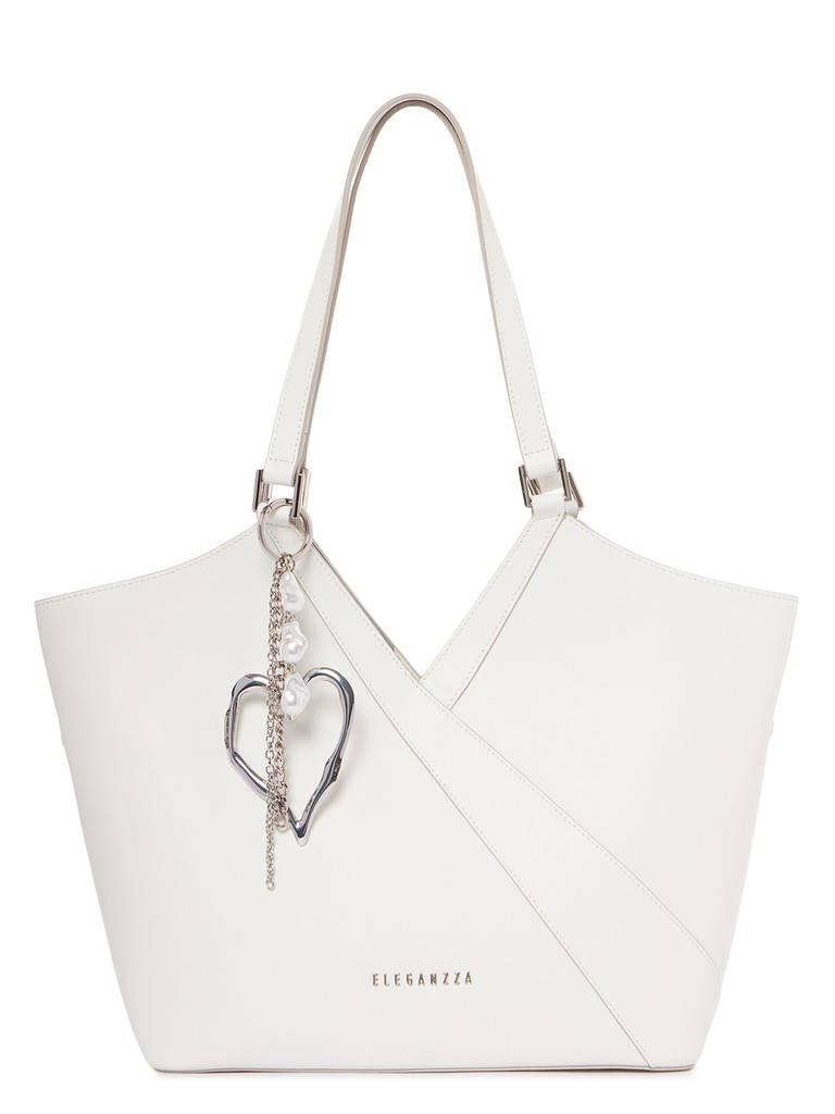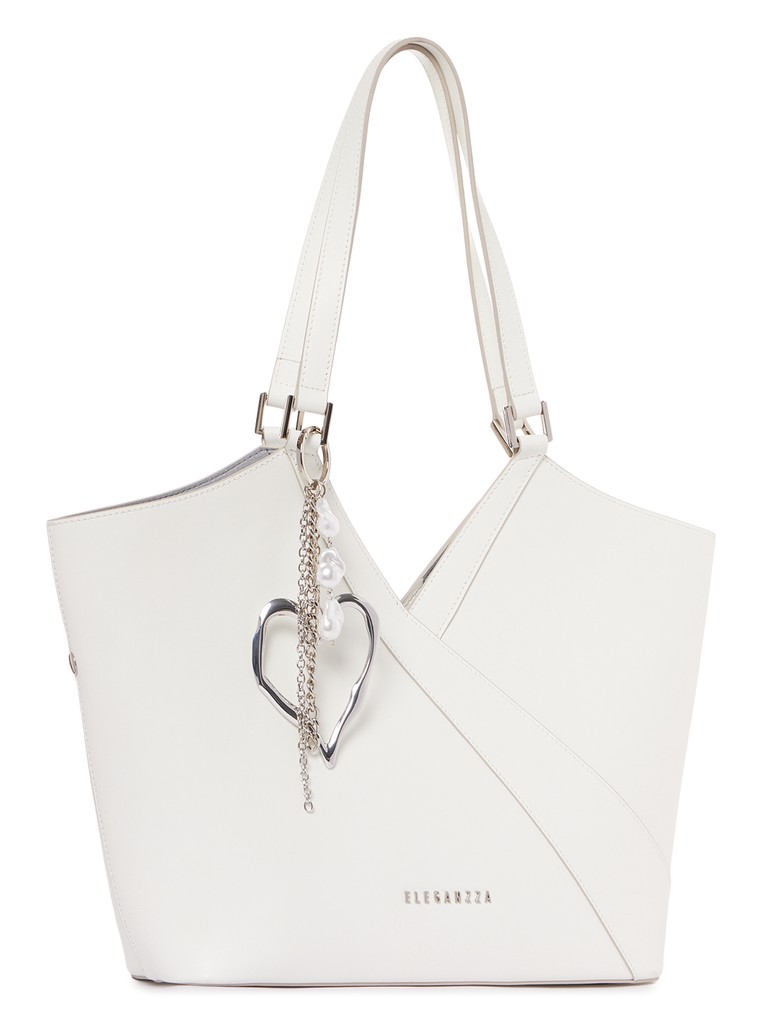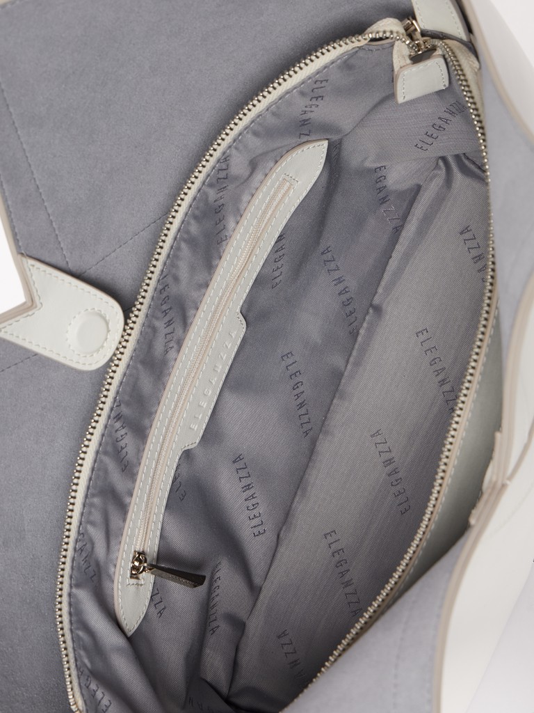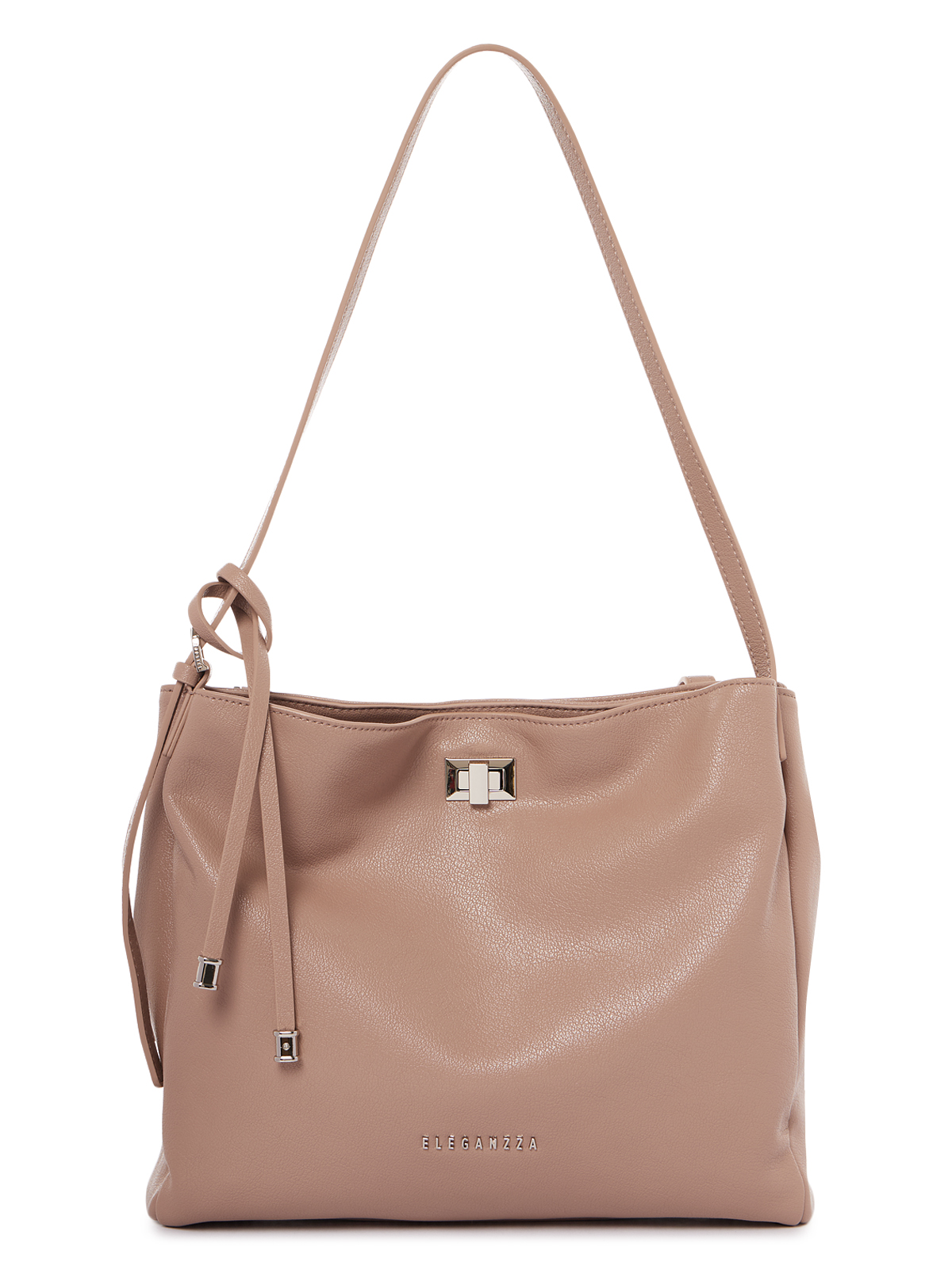 Женская сумка торговой марки Eleganzza из натуральной кожи. Модель закрывается на скрытый магнит. Внутри одно отделение с вкладной косметичкой. Косметичка имеет внешний открытый карман и два внутренних кармана. Высота ручек — 31 см. Вмещает формат А4. Модель не имеет ножек на дне.